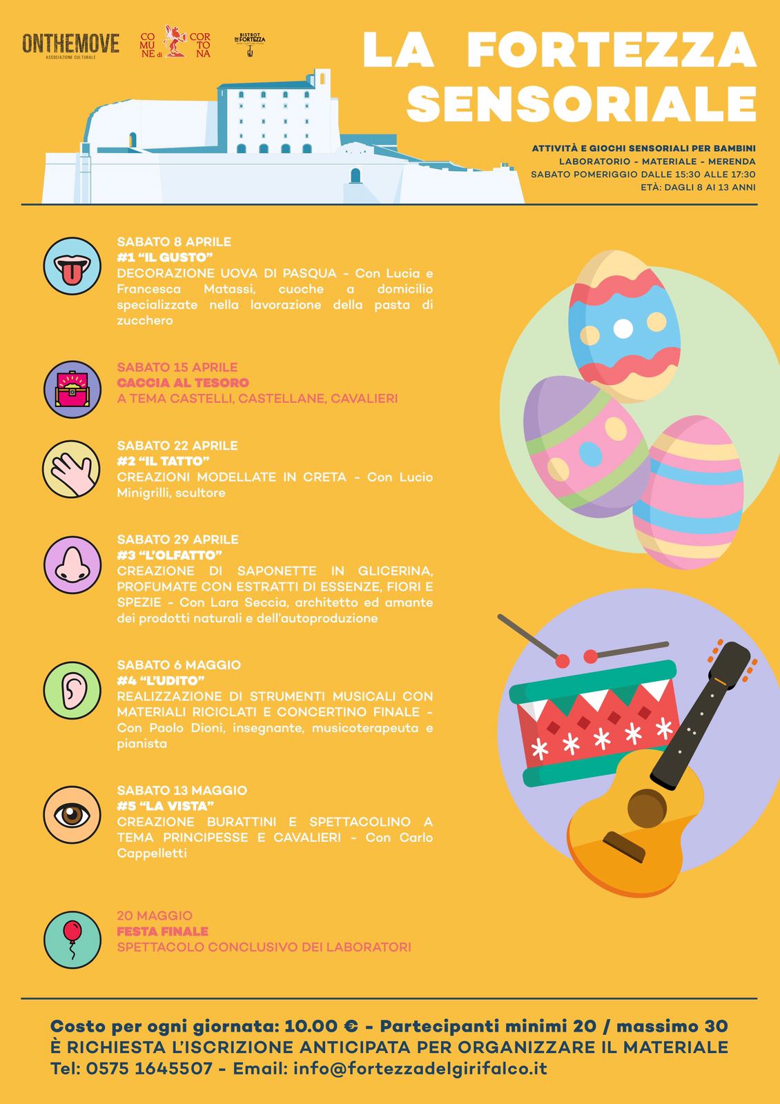 Dall'8 Aprile al 20 Maggio per bambini e ragazzi tra 7 e 13 anni si proporranno laboratori su creatività ed esplorazione de i 5 sensi attraverso attività ludiche e formative per sviluppare la creatività. L'appuntamento è per ogni sabato dalle 15.30 alle 17.30. Un team di professionisti ed insegnanti specializzati seguirà un percorso dedicato alla valorizzazione di un senso tramite la realizzazione di attività che coinvolgeranno tutto il gruppo nella bellissima ambientazione della Cannoniera.
